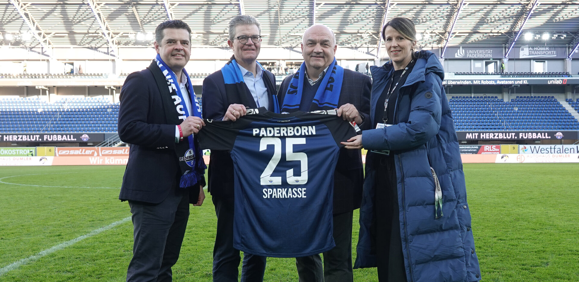 Zum Foto (von links): Andreas Trotz (Mitglied des Vorstands | Sparkasse Paderborn-Detmold-Höxter), Arnd Paas (Vorsitzender des Vorstands | Sparkasse Paderborn-Detmold-Höxter), Thomas Sagel (Präsident | SCP07) und Neele Rickers (Leiterin Marketing, CSR & Entwicklung | SCP07).