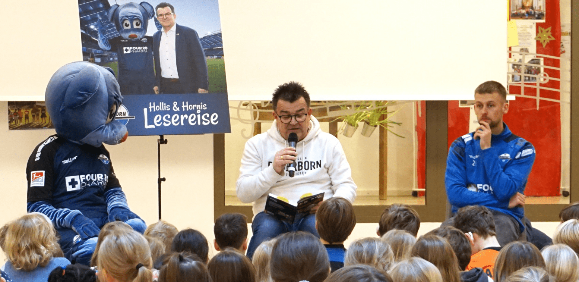 Regelmäßig statten Hornberger und das SCP07-Maskottchen den Grundschulen im Kreis Paderborn einen Besuch ab. "Vielen Kindern wird heute nicht mehr vorgelesen. Das möchten wir ändern", erklärt Hornberger. So lauschten die Schüler aufmerksam der Geschichte der "Drei ???", die im Fall der gestohlenen Meisterschale ermittelten.