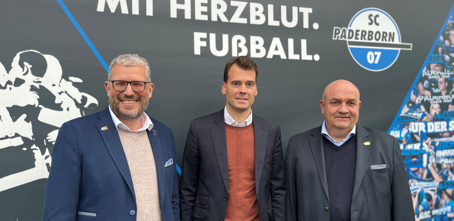 Neuer Kaufmännischer Geschäftsführer: Präsident Thomas Sagel (rechts) und Aufsichtsratsvorsitzender Stefan Rees (links) heißen Alexander Wahler, der zum 1. Dezember sein Amt antritt, in Paderborn willkommen.