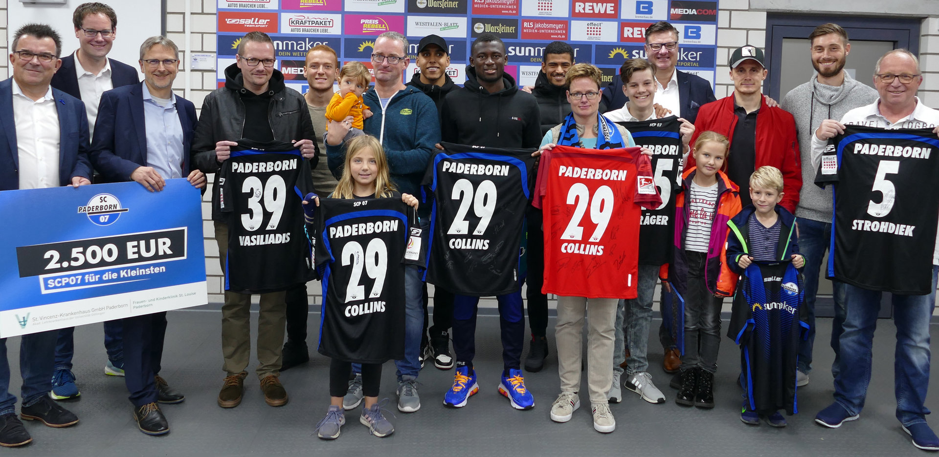 Neben den SCP07-Kickern waren auch Geschäftsführer Martin Hornberger (SC Paderborn 07) sowie Jürgen Thau (Kfm. Geschäftsführer der St. Vincenz-Krankenhaus GmbH) und Dr. Frank Dohle (Kinderklinik St. Louise) gekommen, um sich noch einmal persönlich bei den Spendern zu bedanken. „Wir sind absolut begeistert von der Aktion. Mit einem so hohen Erlös hatten wir nicht gerechnet“, betont Thau bei dem Treffen. „Ein großes Dankeschön an den Verein und an die zahlreichen Mitbietenden für dieses großartige Engagement.“