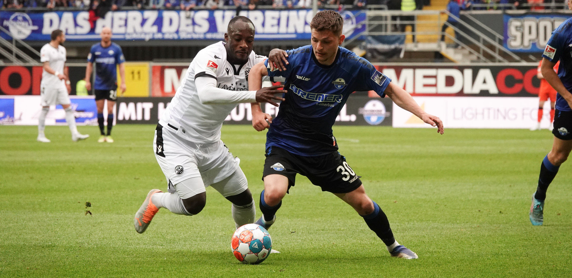 Nach der ersten Chance der Gäste von Pascal Testroet, die Jannik Huth entschärfte (7.), übernahmen die Paderborner die Regie. Dennis Srbeny schickte Klement, der freistehend an SVS-Keeper Patrick Drewes scheiterte (18.). Ein Kunstschuss brachte wenig später die Führung: Muslija setzte den Ball mit einem Rechtsschuss aus 25 Metern in den rechten Winkel (27.).