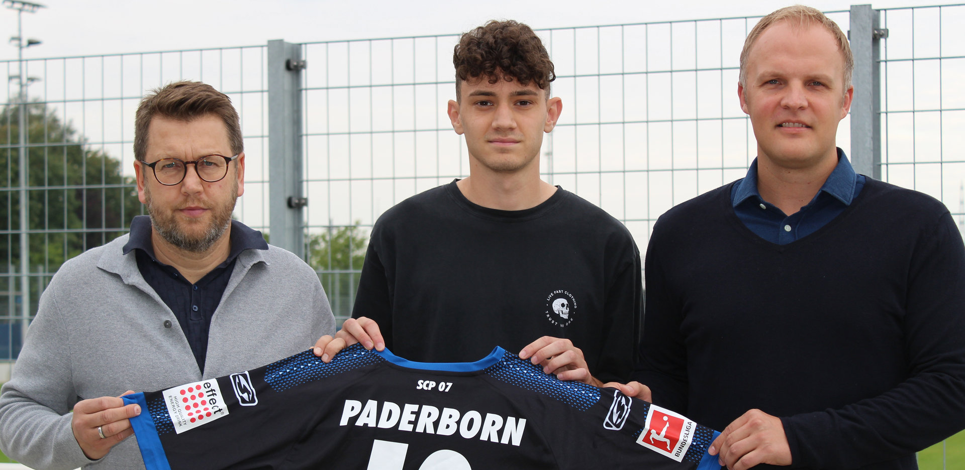 Zum Foto: Geschäftsführer Sport Martin Przondziono (links) und der Leiter des Nachwuchsleistungszentrums, Christoph Müller (rechts), freuen sich mit Dominik Bilogrevic über die Vertragsverlängerung.