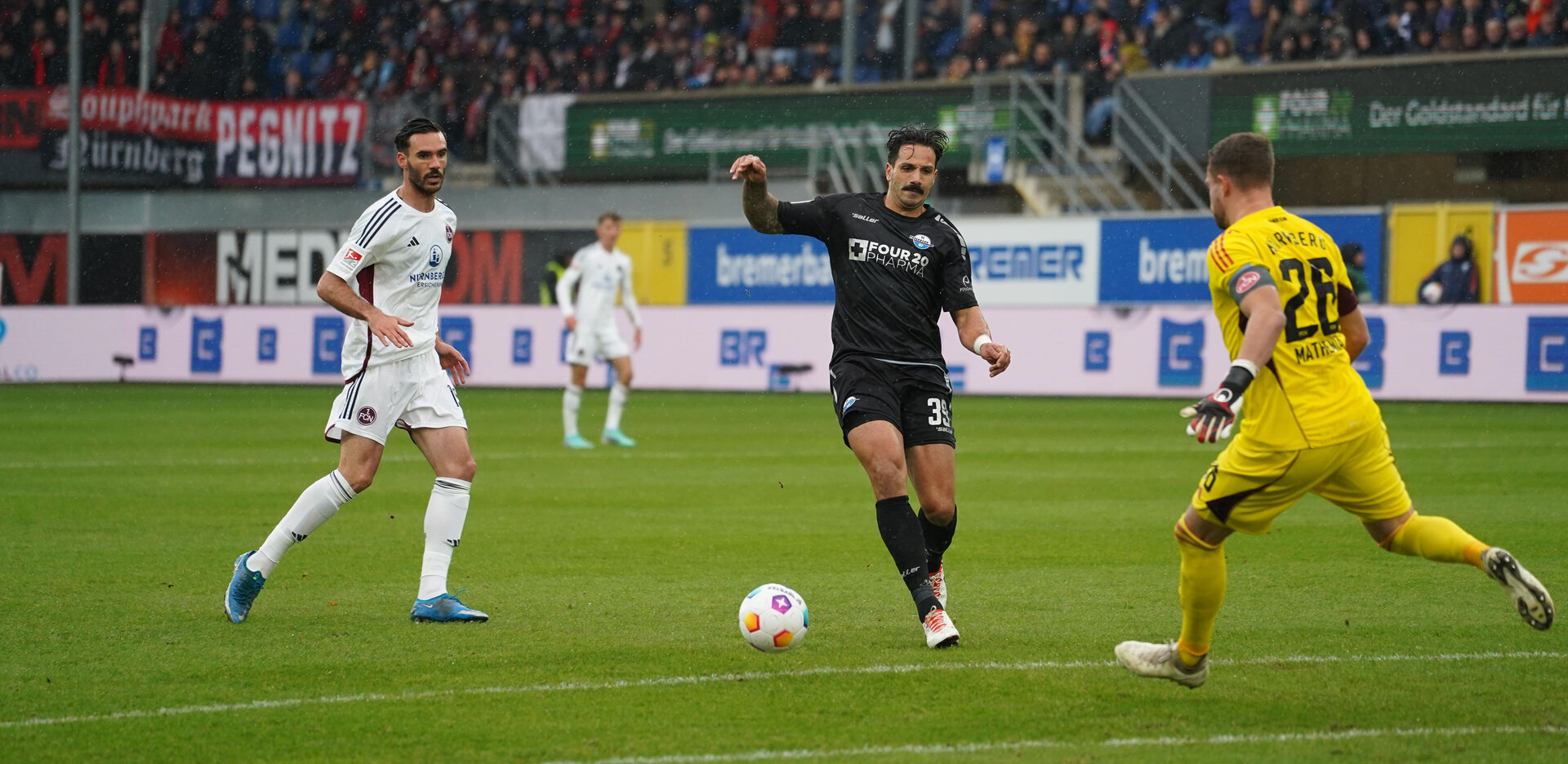 Nach dem Platzverweis gegen Castrop (61.) änderte sich das Bild, jetzt übernahmen die Hausherren die Initiative. David Kinsombi (66.) und Platte (70.) scheiterten an FCN-Keeper Christian Mathenia, Bilbija verpasste am langen Pfosten (68.). Dann köpfte Grimaldi nach Ecke von Obermair zum 3:1 ein (78.). Kinsombi hatte das zweite SCP07-Tor auf dem Fuß, schoss aber drüber (88.).