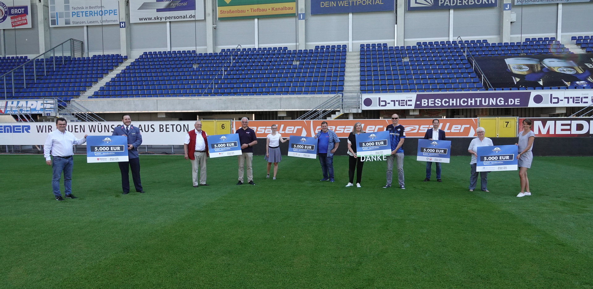 Bei der Scheckübergabe (von links): Martin Hornberger (Geschäftsführer SCP07), Robert Kesselmeier (Malteser Hilfsdienst e. V.), Heinz Köhler und Martin Münsterteicher (beide DRK Paderborn e.V.), Isabelle Götze (CSR, SCP07), Wolfgang Hildesheim (Tafel Paderborn e.V.), Roswitha Schopohl und Stefan Rotthoff (beide Ambulanter Kinder- und Jugendhospizdienst Paderborn-Höxter), Dominik Neugebauer (Caritasverband Paderborn e.V.), Susanne Bockau (Pauline Schule Paderborn), Neele Rickers (Marketing & CSR, SCP07)