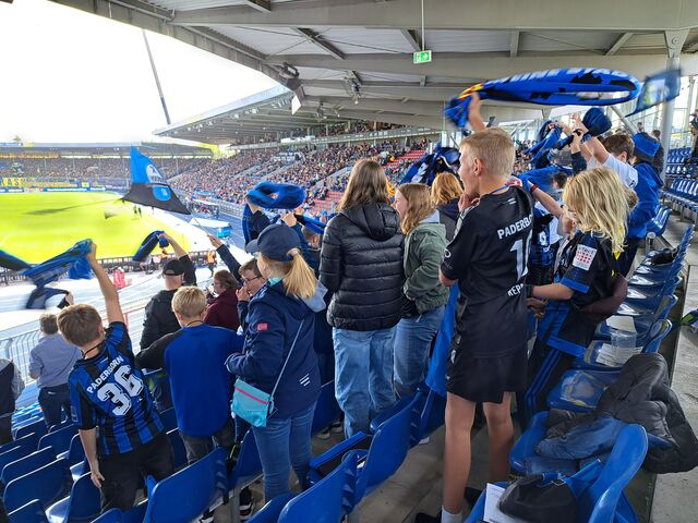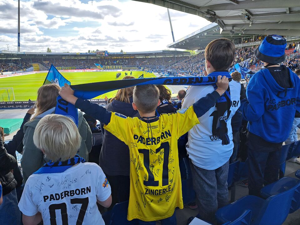 Dort angekommen versorgten sich erstmal alle mit Essen und Getränken, bevor es hoch in den Block ging. Oben angekommen dauerte es nicht lange bis die Kinder in die Fangesänge der anderen mitgereisten SCP07-Fans einstimmten. Ausgestattet mit ihren Schals und Fahnen konnte es also los gehen. Bereits nach 11 Minuten brachte Hansen den SCP07 in Führung. Danach gab es kein Halten mehr! Die Kinder waren ganz aus dem Häuschen und sangen und jubelten mit voller Kraft. Vor der Halbzeitpause konnten die Kids sich über ein weiteres Tor von Obermeier freuen. In der zweiten Halbzeit lag das Spiel mehr auf Seiten von Eintracht Braunschweig, trotzdem gaben die Kinder weiter alles! Nach einem Anschlusstreffer der Braunschweiger konnten sich die Kinder in der Nachspielzeit aber noch über ein Tor von Bilbija. Wer wohl auf ein 1:3 getippt hat und sich damit über eine von einem SCP07-Profi getragene Fußballhose freuen durfte?